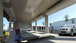 This project attempts to make a positive customer experience of visiting a vehicle maintenance center by offering an appealing architectural experience. This includes tropical landscaping, an interior showroom, and dramatic wooden structural trusses at the main lobby.
